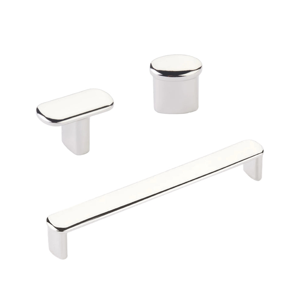 Collection of Lake drawer pulls and cabinet knobs in a wide range of sizes in polished nickel which work perfectly as a drawer pulls and cabinet door handles. Comes with screws.