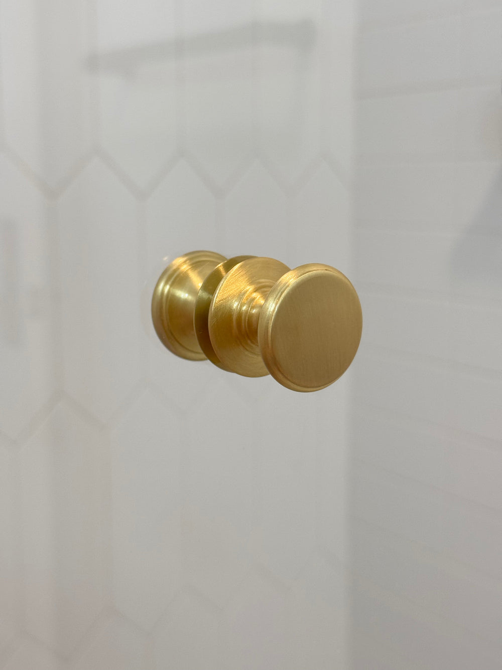Round Satin Brass "Penny" Round Glass Shower Knob. This item is a double-sided shower door knob suitable for glass shower door. A simple and classic design that works perfectly for shower doors. This item is listed here in satin lacquered brass which will not patina and will maintain the same finish over time.