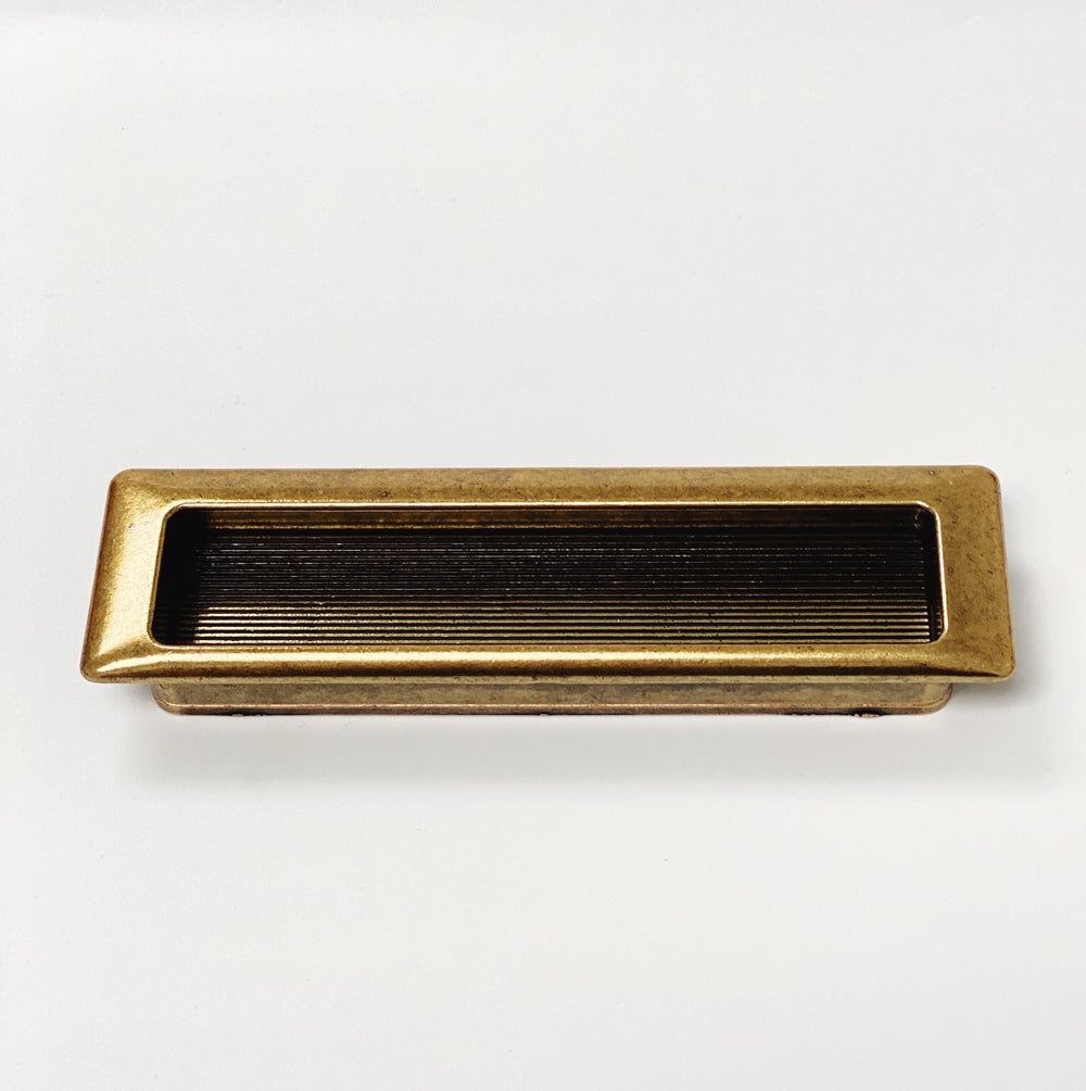 Recessed brass drawer pulls in antique brass finish. Beautiful Brass Drawer Pulls. Comes with mounting hardware.