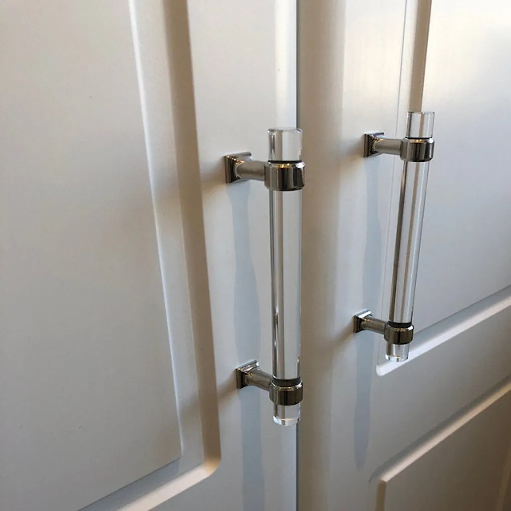 These beautiful clear lucite and polished nickel t-bar drawer pull will dress up any space and make it look chic and elegant. Solid acrylic bar with metal posts.