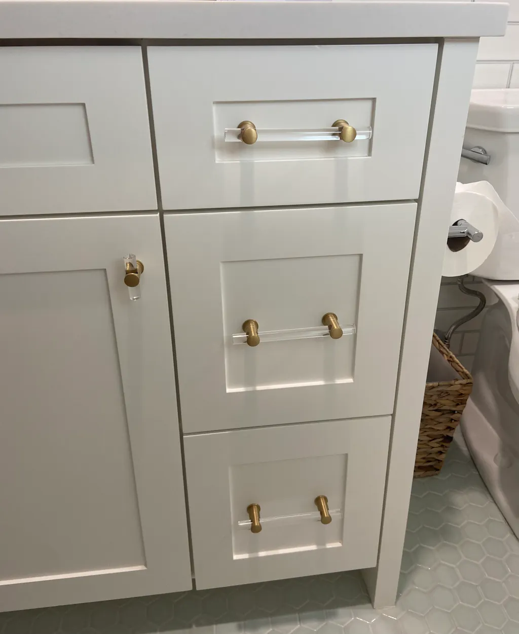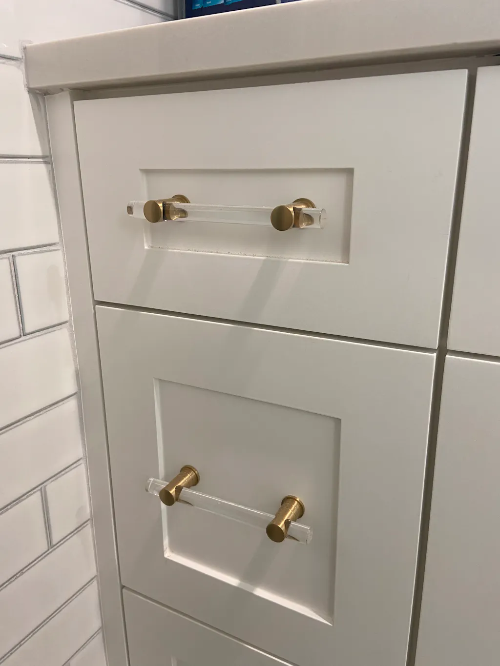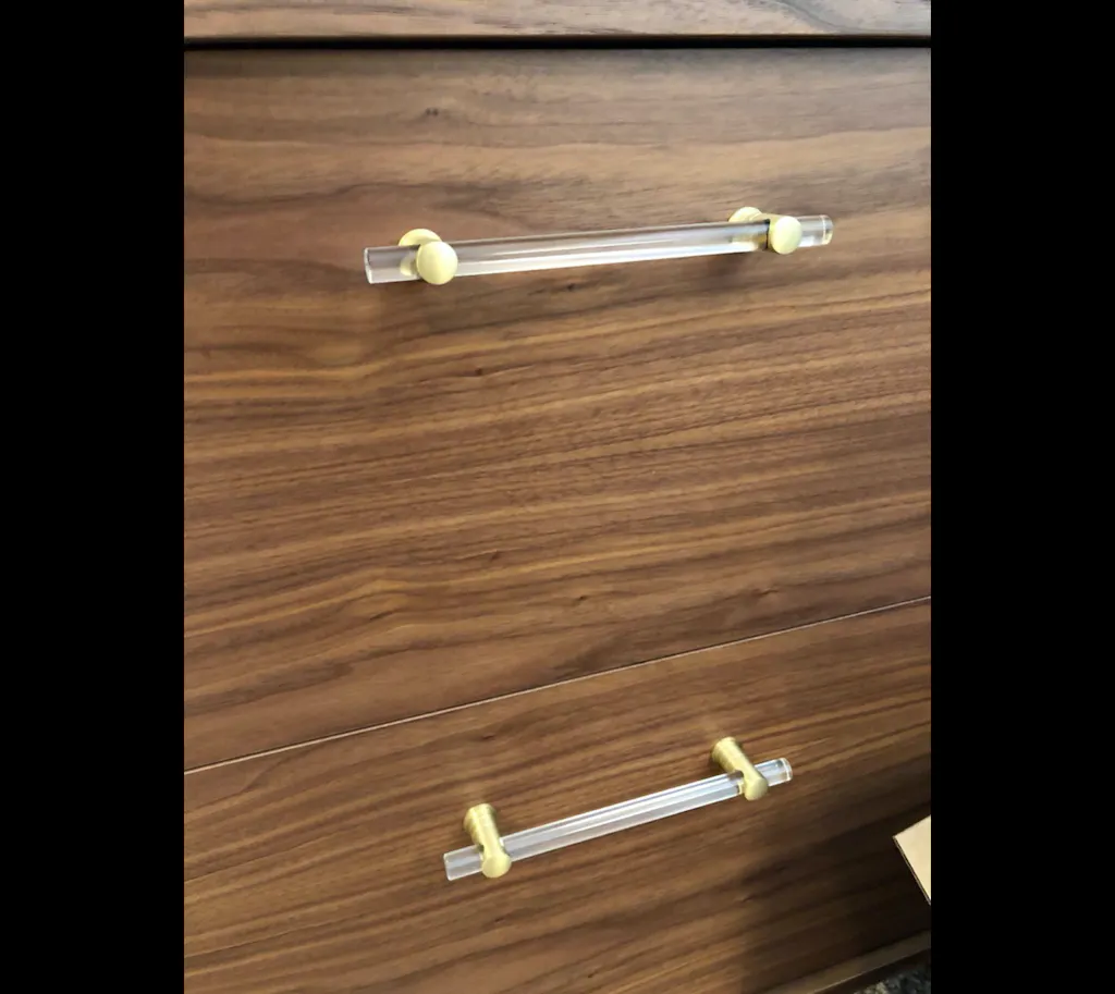 The lucite and satin brass pulls work on many pieces including kitchen cabinets, a nursery or unique furniture pieces. The items are made with high-quality solid brass posts and a high-end lucite rod.