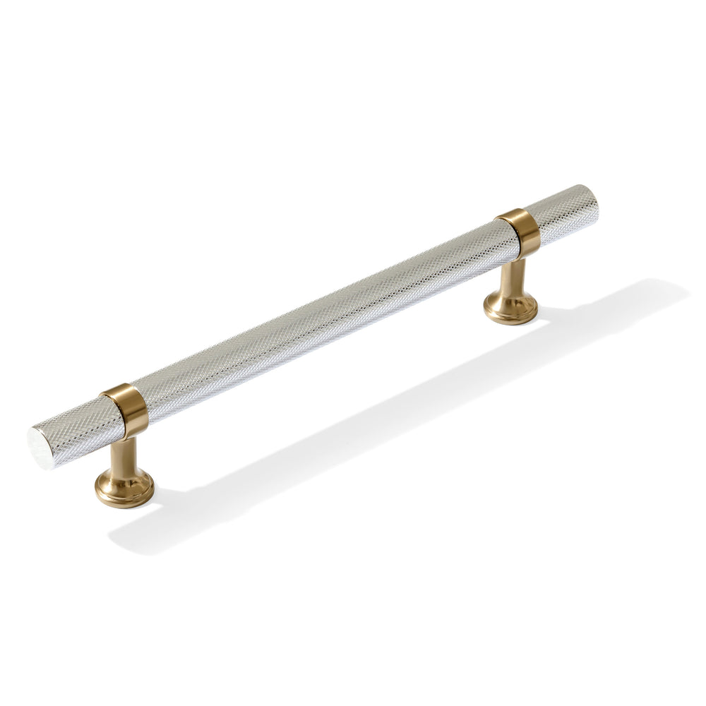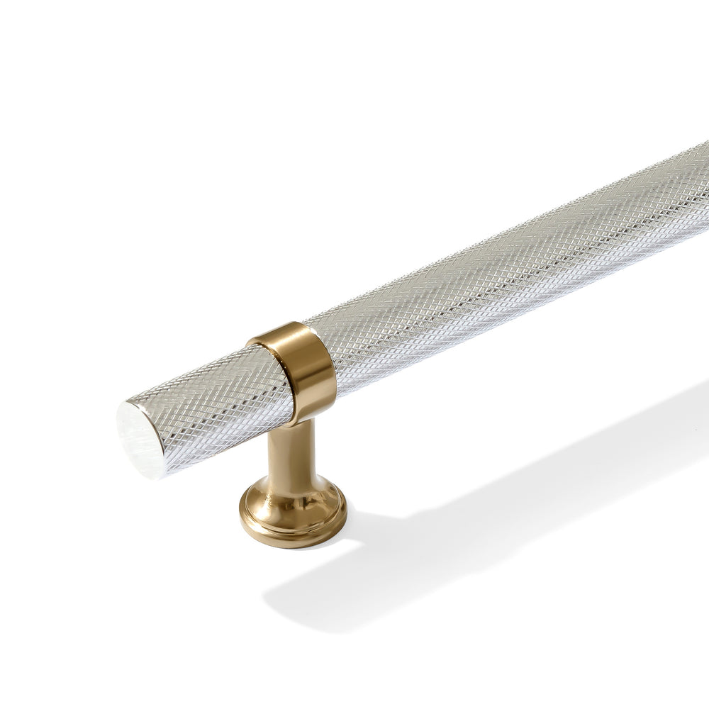 These beautiful dual-finish champagne bronze and polished chrome knurled contemporary t-bar cabinet knobs and drawer pulls are uniquely modern and will make a perfect design statement in any space. The wide range of sizes in both drawer pulls and appliance handles is unparalleled.