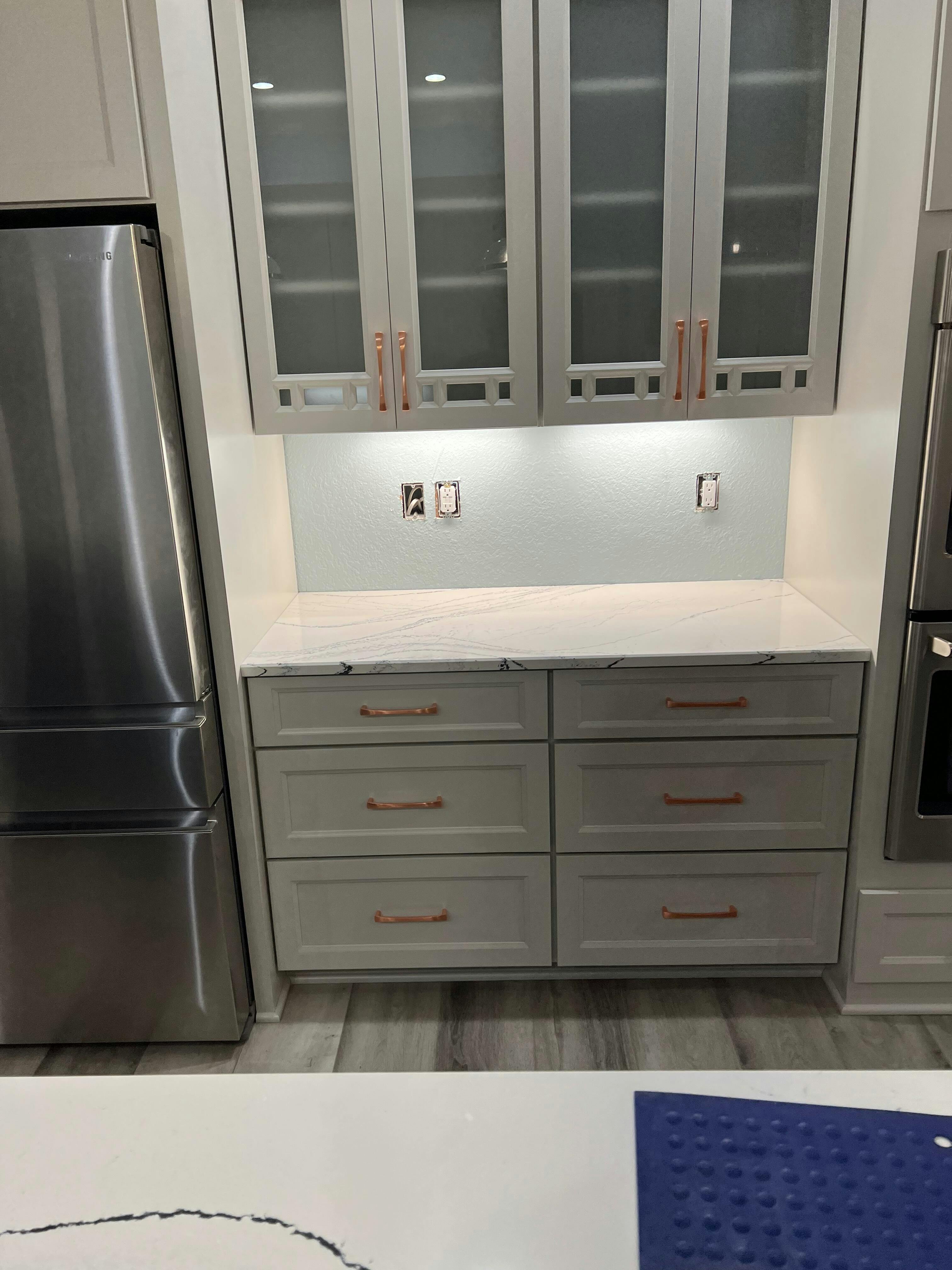 Satin Copper "Kent" Drawer Pulls and Knob - Knob is backordered and will ship as soon as it is back in stock.