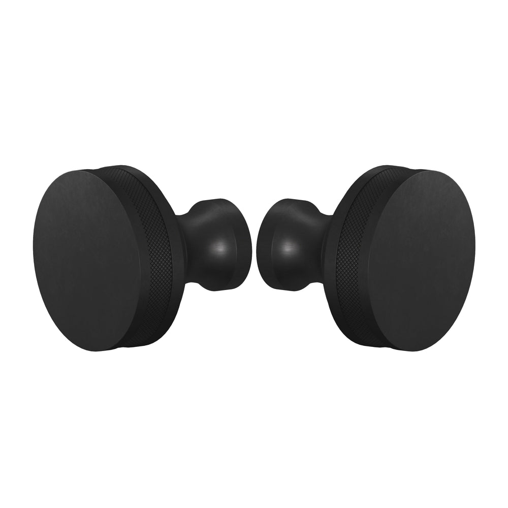 Matte Black "Knurled" Round Glass Shower Back to Back Door Knob. This item is a double-sided shower door knob suitable for glass shower door. A simple and stylish design that works perfectly for shower doors. The finish on this item is lacquered and will not patina.