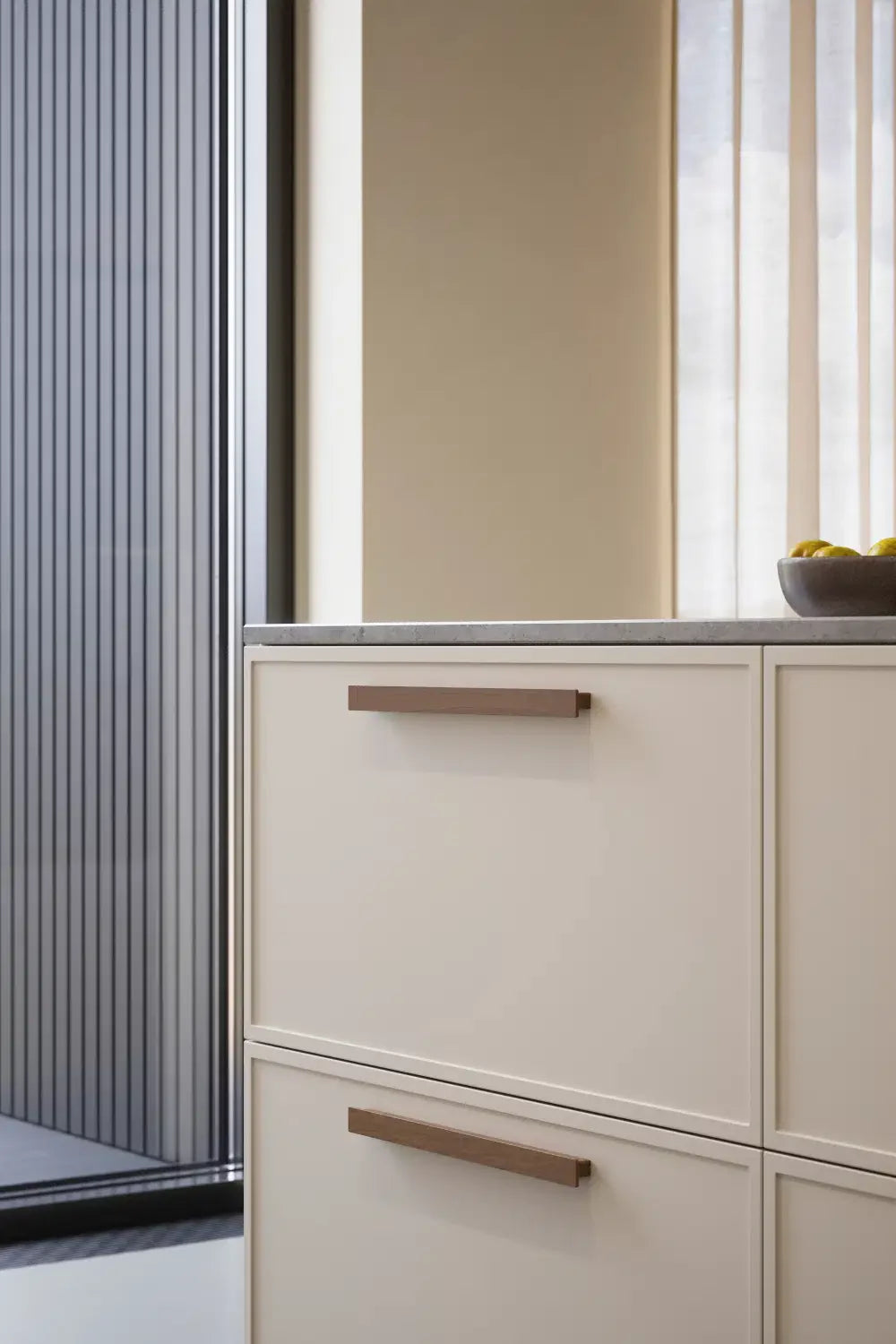 Shelter is an elegant profile handle, with a distinct step at the top. Its design is carefully optimized with sharp edges and angled surfaces to achieve the best possible functionality and aesthetics. The construction of the handle prioritizes an exemplary grip surface and therefore combines aesthetics and functionality in the most beautiful way.